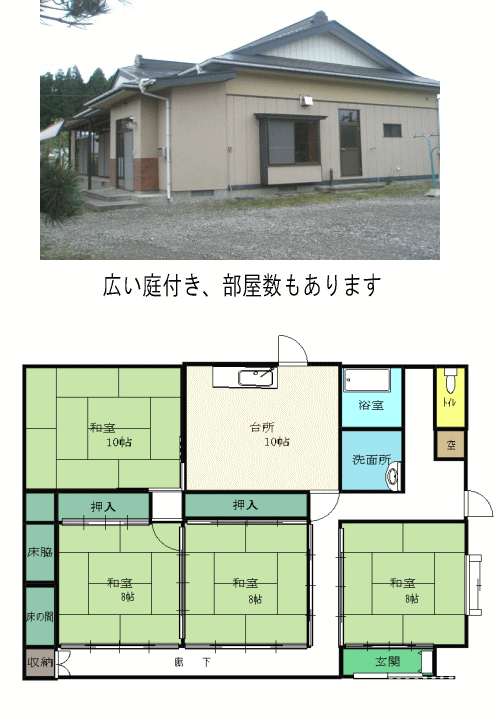 物件名下多田川貸家 所在加美町下多田川字中山15-1 所在地区加美町下多田川 空情報満室 間取り4DK 間取内訳和8×3・和10×1・台所・洗面所・浴室・トイレ 構造木造平屋建 設備LPガス・簡易水洗トイレ・シャワー・照明器具有 専有面積54.65㎡ 家賃50,000円 共益費なし 駐車場無料 敷金3ヶ月 仲介料1ヶ月(+消費税) 保険料15,000円(2年間) 保証料有り